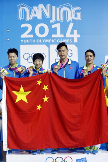 8月17日,在南京奥体中心游泳馆进行的青奥会游泳比赛中,中国队以3分27秒02的成绩夺得男女混合4×100米自由泳接力赛冠军。我院选手沈铎是团队的最后一棒,她在比赛中顶住压力,锁住优势,帮助中国队问鼎。这是江苏运动员在本届青奥会上的首金。