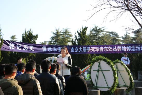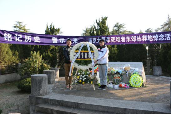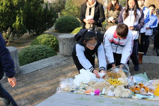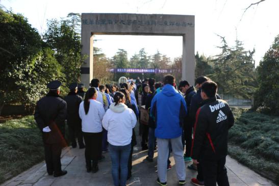 2014年12月13日上午,国家公祭日,运动系组织大学生来到南京大屠杀死难者东郊丛葬地进行悼念活动。辅导员杨孟向同学们介绍了南京大屠杀这段惨痛的历史,中国近代百年的屈辱一次次印证了“落后就要挨打”。学生代表张雨在仪式上发言,77年,青丝染成白发,那段血染历史的幸存者仍在世已不过百人。紧接着同学们为遇难者默哀1分钟,默哀完毕后同学们轮番上去为遇难者献上自己做的小白花,在献上自己的哀思后,同学们默默地退出了这片土地。陵园外,运动系副书记葛见珠慷慨激昂地向学生讲述了自己的感想,唤起了同学们维护祖国和平的满腔热情。警钟长鸣,勿忘国耻,振兴中华,从我做起