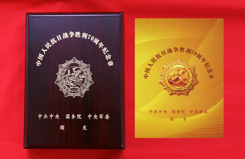 “中国人民抗日战争胜利70周年纪念章”是2015年中共中央、国务院、中央军委为健在的或2015年1月1日后去世的抗战老战士、老同志,抗战将领或其遗属颁发的纪念勋章,以表彰抗战老战士老同志和抗战将领对中国人民抗日战争和世界反法西斯战争胜利作出的历史贡献。纪念章围绕着“铭记历史、缅怀先烈、珍爱和平、开创未来”的主题设计,由抗日战士浮雕、延安宝塔山、黄河、橄榄枝、光芒5大元素构成。纪念章包装盒注明由“中共中央、国务院、中央军委”颁发,置有纪念章相关设计的介绍页。