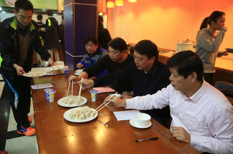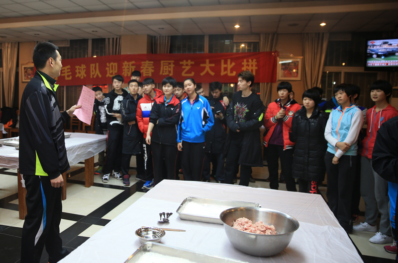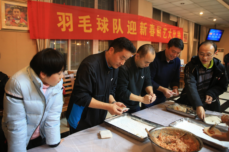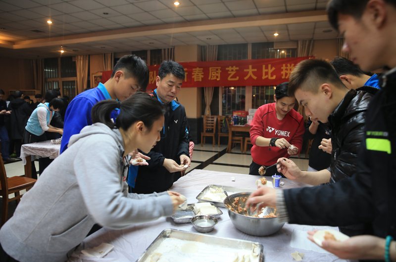 12月31日晚,羽毛球队迎新春厨艺大比拼活动在运动员食堂举行。训练处处长张健、羽毛球系系主任罗福亭、党委宣传部副部长许立俊、总务处副处长顾善全、运动康复医院副院长王家祥等部门领导和30余位羽毛球队队员及教练参加了本次活动。30余位羽毛球队队员分成4组参赛。由张健、许立俊、顾善全等5人组成的评委小组对4支参赛队伍端来的饺子从外形、口味等方面进行了评分,决出最佳外形、最美口味、最具创意三个奖项的一、二、三等奖。羽毛球系系主任罗福亭和威克多工作人员为获奖队伍颁奖。