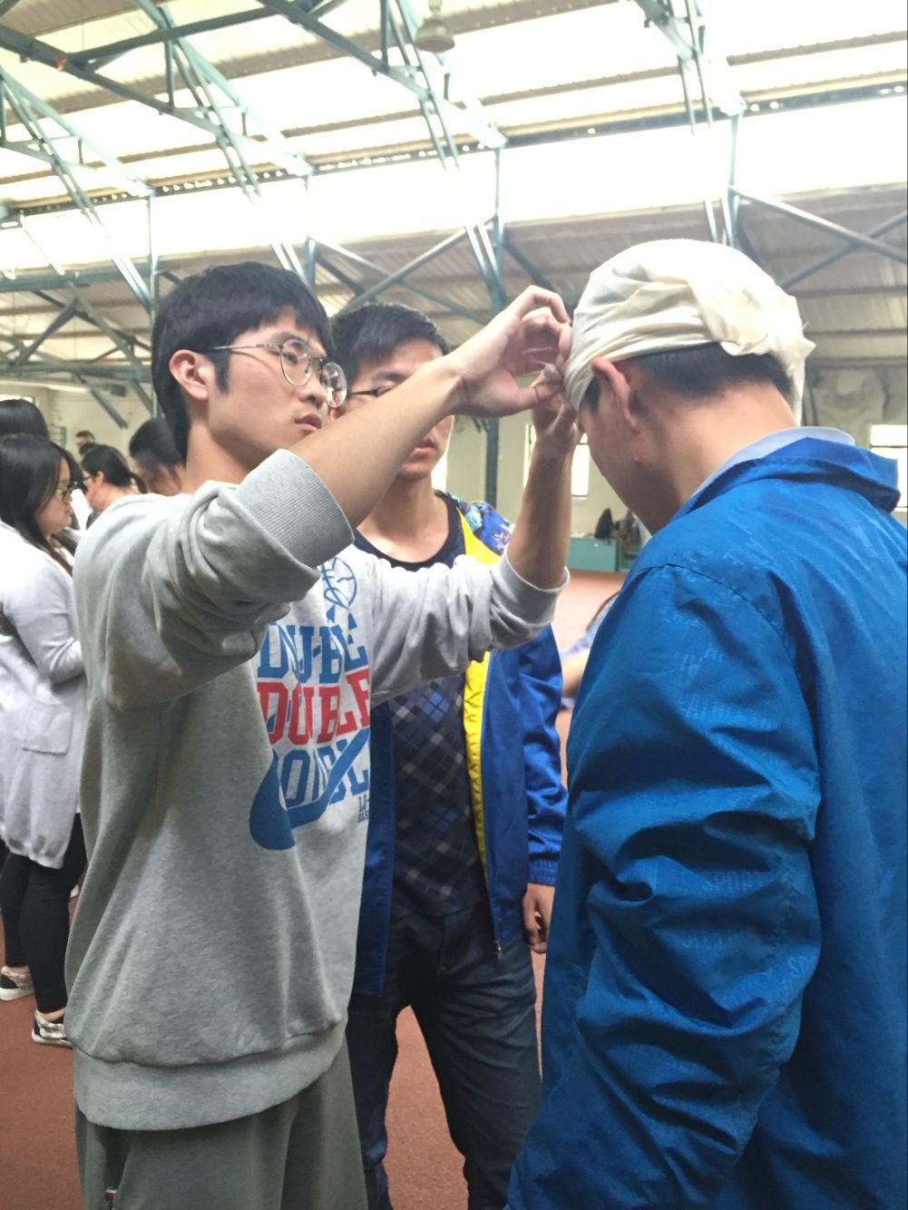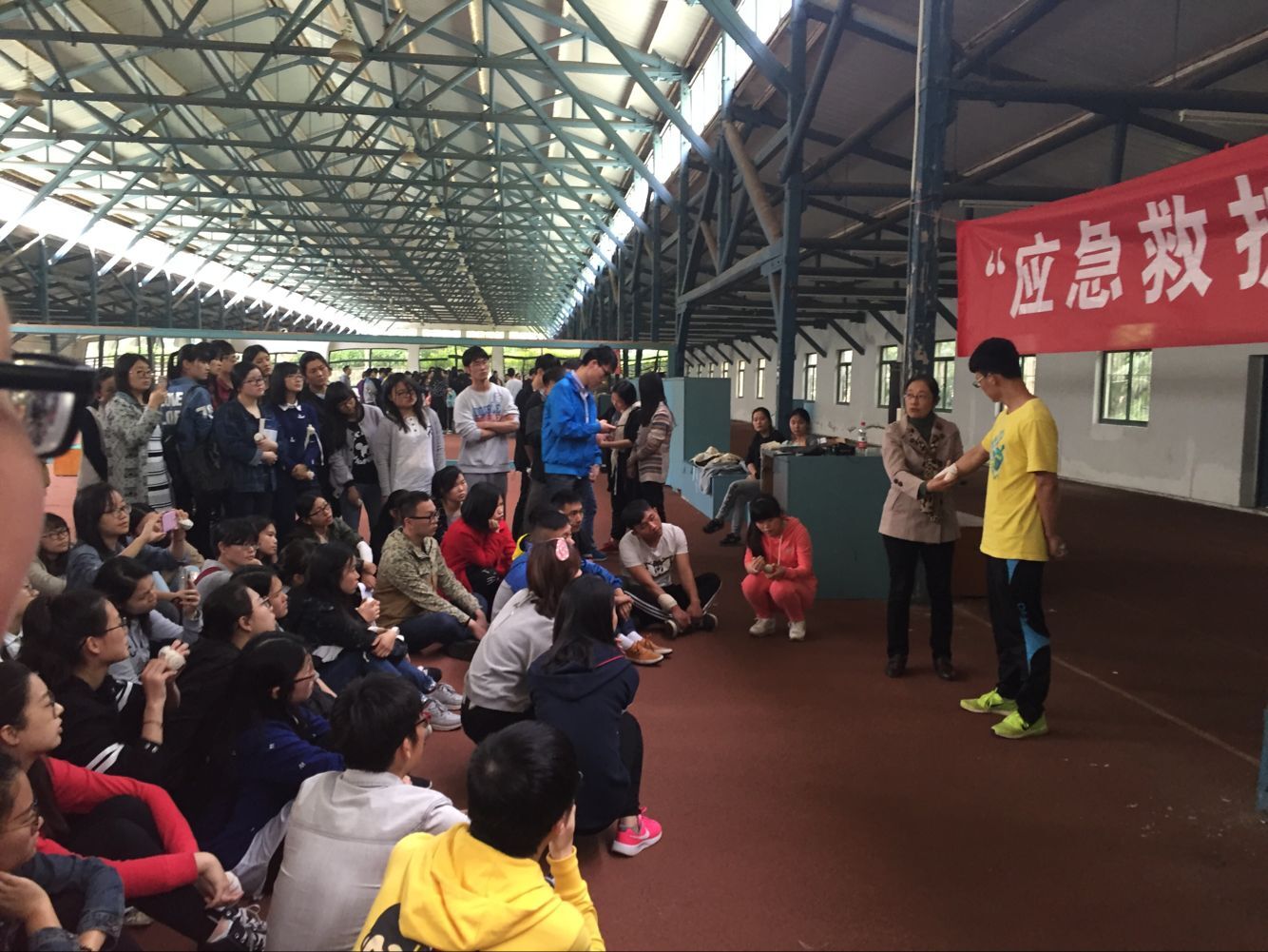 428日中午12点,“应急与救护”社团(简称“急救”社)第二次活动暨“现场包扎技术”培训在校田径武术馆举行。活动邀请运动健康科学系副主任马林教授主讲包扎知识与技术,社团指导老师喻菊和社团全体成员参与活动。