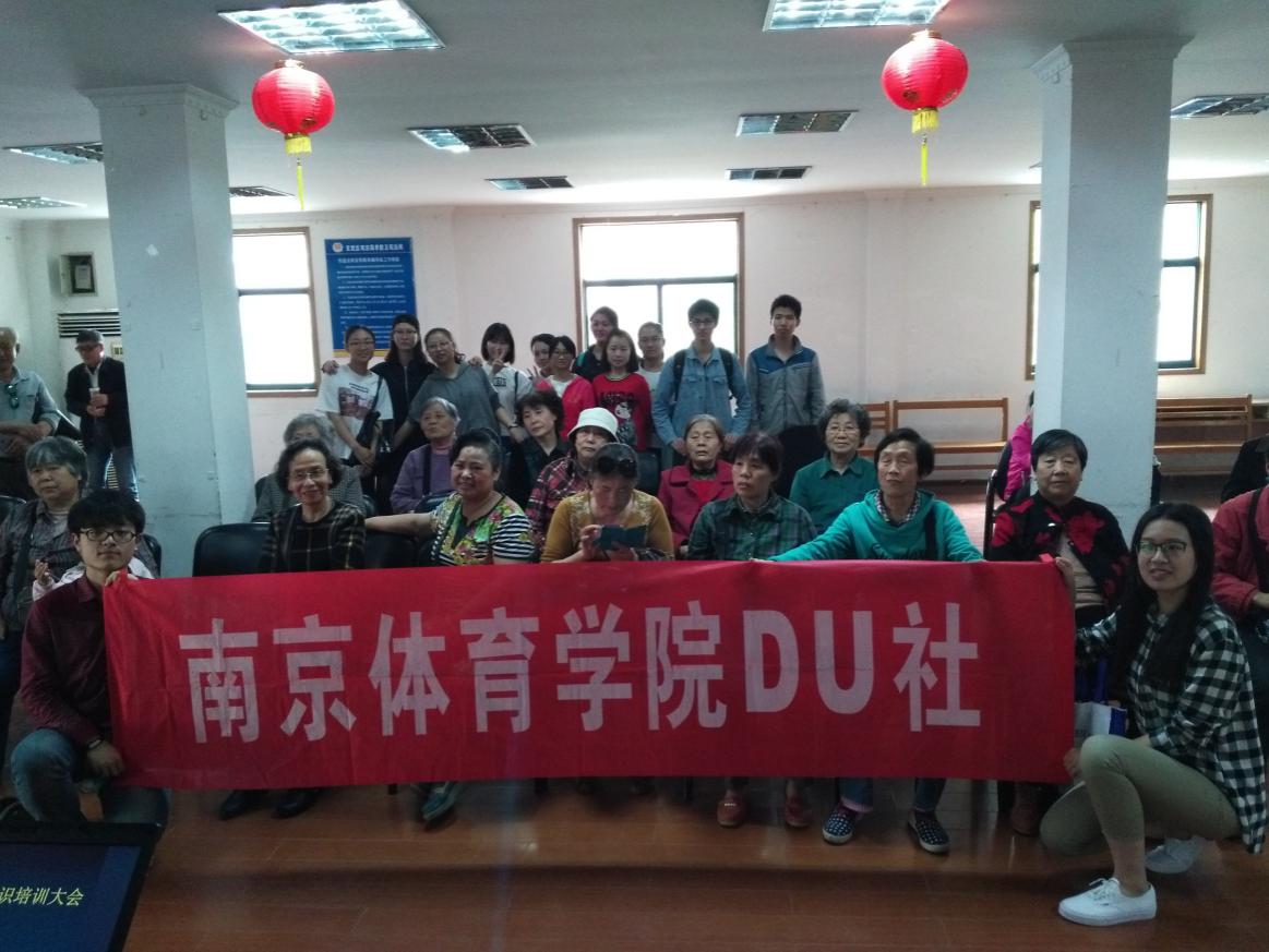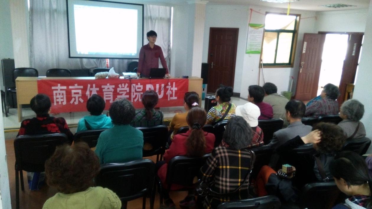 当日下午,在“DU”社指导老师、运动健康科学系团总支书记、辅导员喻菊老师和社长夏忆汝、副社长王宇笛带领下,社团成员早早到达会场,布置场地。经过前期的认真策划和有序分工,准备工作有条不紊。本次活动旨在以讲座的形式把“运动就是良医”的理念带到社区,为社区居民普及科学锻炼的知识。在社区居民们的热情包围下,会场座无虚席,现场气氛轻松欢快,不时互动。主讲王宇笛同学分别从运动的重要性、健身走的益处和健身走的形式等三个方面向大家做了详细介绍。居民们时而点头,时而低声交流,收获满满。讲座中,社团成员还向居民们展示了不同类型的健身走,并邀请大家参与其中,将会场气氛推向了高潮。活动最后,同学们向到场居民赠送水果,提醒大家运动后要及时补充维生素。