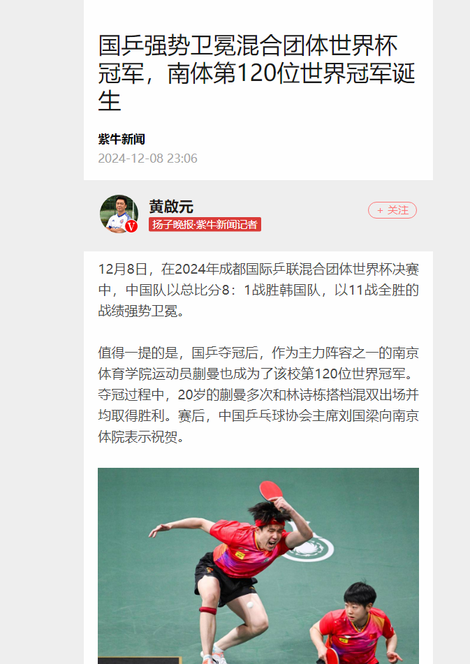 【南京晨报】蒯曼助力,国乒夺冠!taptap国际服账号注册培养出第120位世界冠军