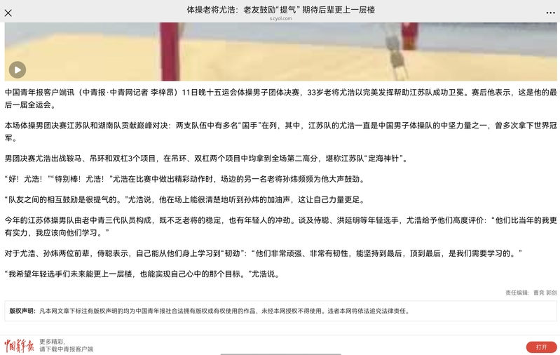 【中国青年报】体操老将尤浩:老友鼓励“提气” 期待后辈更上一层楼