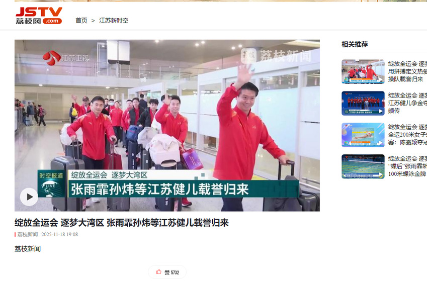 【荔枝新闻】绽放全运会 逐梦大湾区 张雨霏孙炜等江苏健儿载誉归来
