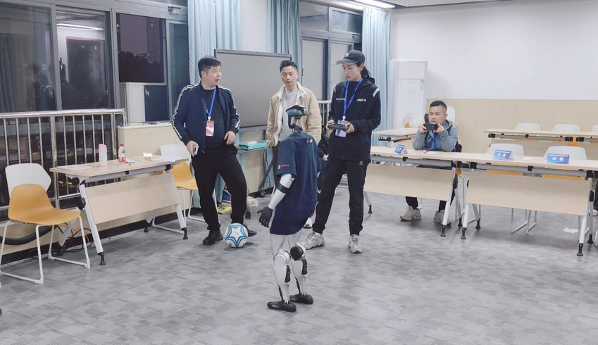 在决赛现场,戴清清老师抽选《局部进攻配合——直传斜插二过一》作为教学展示课题。她打破传统足球教学的局限,将智慧 AI 技术全程融入教学流程,打造了沉浸式、互动式的高效课堂。课堂伊始,通过线上 AI 实践足球场景模拟对话,快速激发学生学习兴趣;教学过程中,借助智能机器人模拟训练,有效破解传统教学中实操指导难、场景还原难的痛点;课程结尾,运用智能足球装备实时监测学生技术动作,实现教学效果的精准评估,真正践行了因材施教的教学理念。