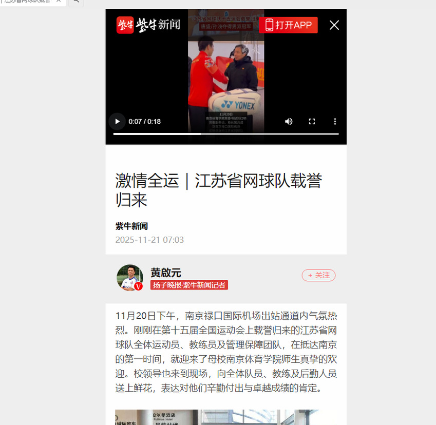 【紫牛新闻】激情全运|江苏省网球队载誉归来