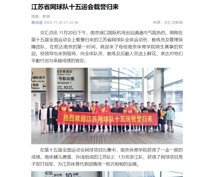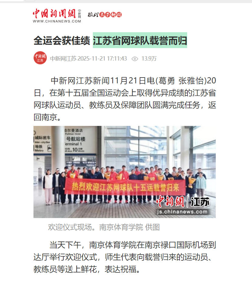 【交汇点新闻】江苏省网球队十五运会载誉归来