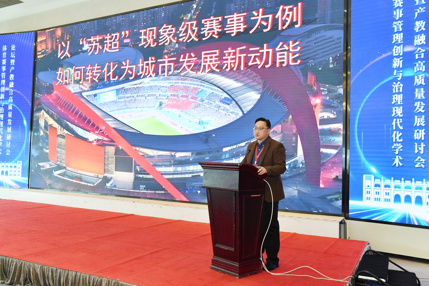 江苏省体育科学研究所副研究员、《体育与科学》编辑部主任闫士展代表江苏省体育科学学会秘书处致辞。他强调,体育赛事已从传统的竞技平台转变为推动社会治理现代化、激活城市消费潜能的重要载体。江苏通过打造“苏超”等本土赛事品牌,在赛事组织、公共服务、文化建设等方面形成了独具特色的治理模式,为全国体育治理现代化提供了实践经验。