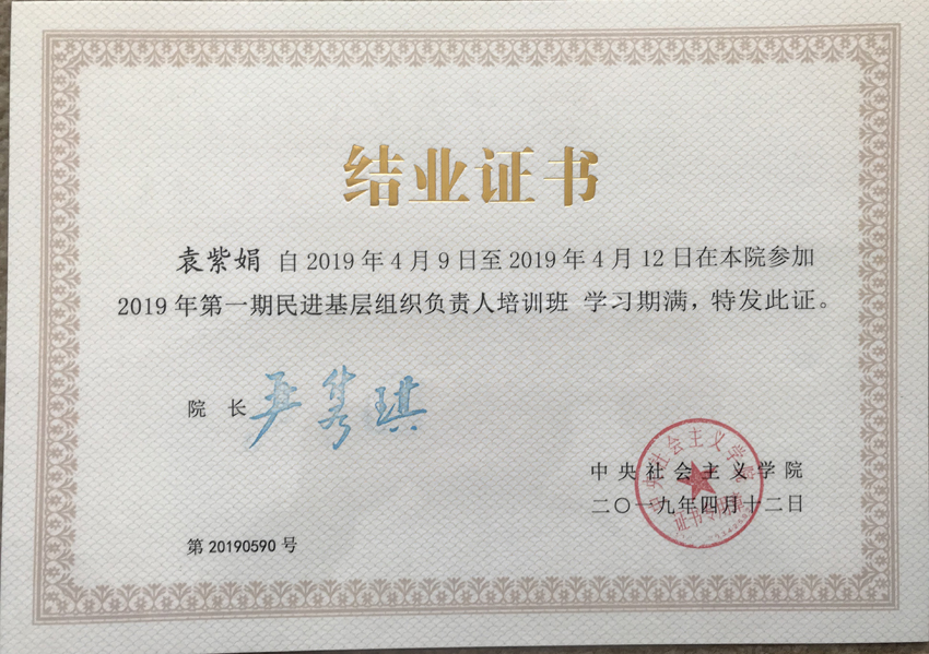 4月9号至12日,民进中央2019年第一期基层组织负责人培训班在中央社会主义学院举行。民进bjycgold支部主委、我校体操队教练袁紫娟参加了培训。