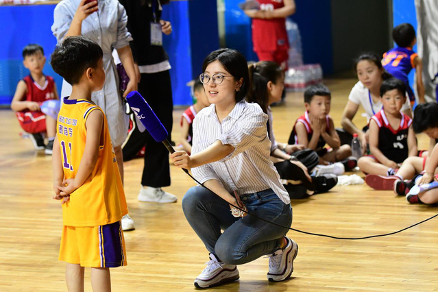 参与媒体赛事服务的学生在采访小朋友