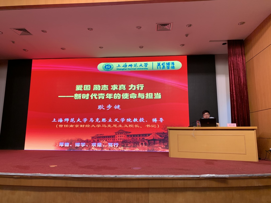 马克思主义学院特别邀请了上海师范大学马克思主义学院耿步建教授进行主讲,耿教授现任上海市德育课程教学研究基地执行主任,曾获江苏省第九届高校哲学社会科学研究优秀成果一等奖、江苏省思想政治教育工作先进个人、省级教学成果优秀奖等。讲座由体育教育与人文学院党总支书记邹国忠主持,马克思主义学院、体育教育与人文学院与校团委的相关领导、教师及300多名同学在现场感受了这一场精神盛宴。
