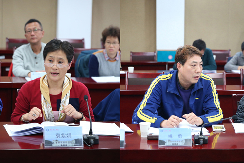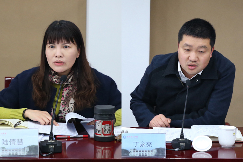 纪委副书记、监察处处长陆倩慧(左),党办、校办副主任丁永亮(右)分别对“两委”工作报告作说明