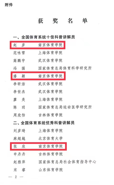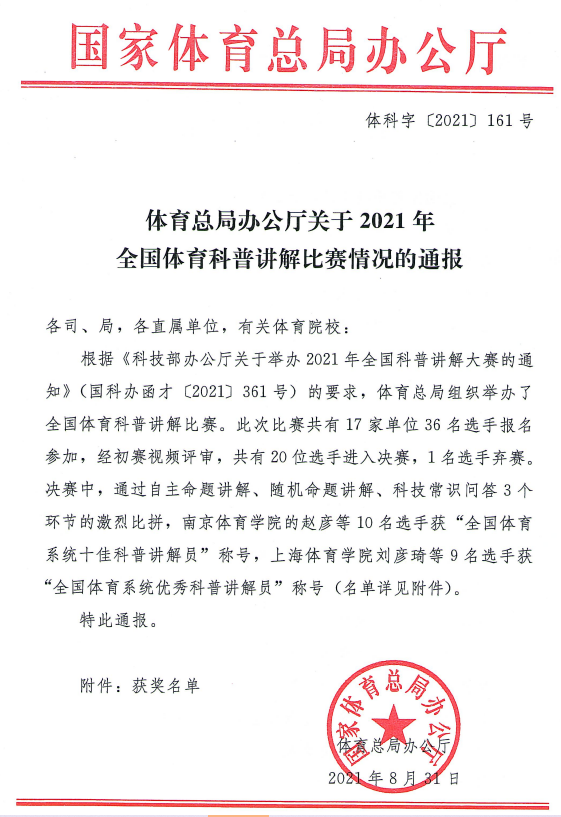 近日,国家体育总局公布了2021年全国体育科普讲解大赛的获奖名单,我校赵彦和潘颖老师获“全国体育系统十佳科普讲解员”称号,张欣老师获“全国体育系统优秀科普讲解员”称号。其中,赵彦老师将以2021年全国体育科普讲解大赛第一名的身份,代表国家体育总局参加2021年全国科普讲解大赛。