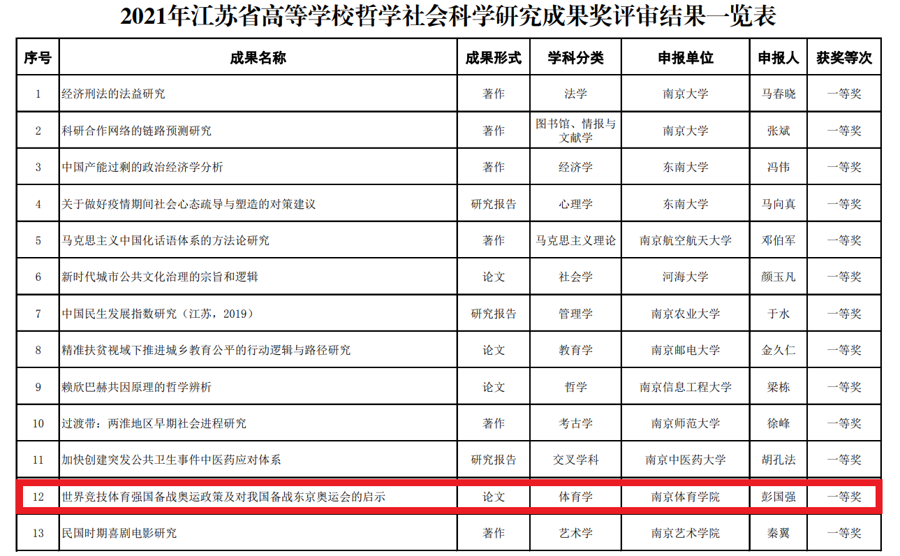 日前,省教育厅公布了2021年江苏省高等学校哲学社会科学研究成果奖的评审结果,我校彭国强老师的论文《世界竞技体育强国备战奥运政策及对我国备战东京奥运会的启示》荣获一等奖。这是全省体育学学科唯一的一等奖,同时也实现了我校哲学社会科学领域的重大突破。此外,我校董艳梅老师的著作《中国高铁的经济效应研究》荣获三等奖。