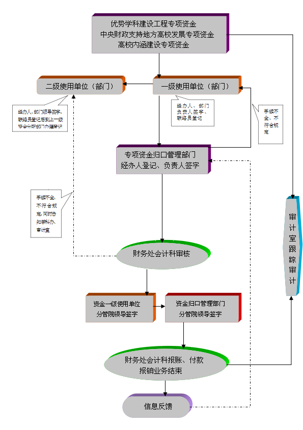 优势学科建设工程专项资金、中央财政支持地方高校发展专项资金、高校内涵建设专项资金报销流程图
