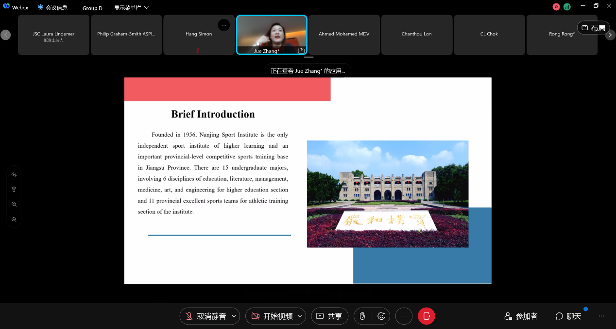 我校党政办(国际交流办公室)副主任张珏受邀参加了本次会议并作大会发言。通过图文并茂的文稿展示,介绍了我校参加东京奥运会的收获与经验,分享了下一个奥运周期我校的战略规划及工作打算,并为协会的未来发展送上了美好祝愿。