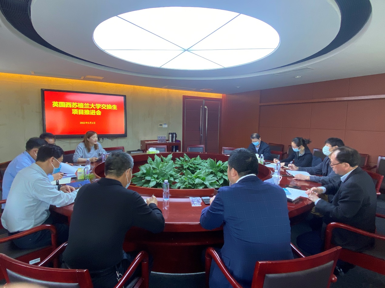 会上,党政办副主任张珏详细介绍了我校与英国西苏格兰大学最新合作进展以及两校2022年秋季交换生项目的基本情况。相关职能部门及二级学院负责人对项目资助政策、学生选拔条件、课程语言要求等问题进行了讨论。最后,党政办主任丁永亮对会议内容作进一步总结,明确了两校交换生项目推进工作的分工安排与时间节点,希望各部门通力配合,把事情做成做好,并以此次项目为抓手,积累国际交流经验,努力实现更多合作办学项目。