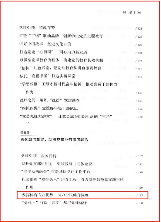 近日,由江苏省委教育工委组编的《江苏高校党建工作典型案例100例》正式出版,我校武术与艺术学院党总支党建工作案例《发挥体育专业优势 助力全民健身抗疫》成功入选,这是我校党建工作案例首次入选省级党建案例汇编书籍。