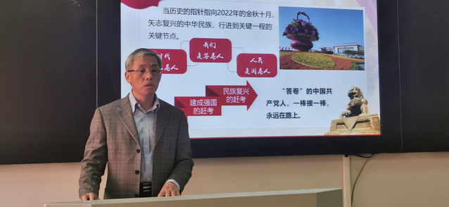 黄步龙追溯党的历史,以党中央自西柏坡迁往北京时“进京赶考去”的口号引入,带领大家重温了2021年7月1日习近平总书记在庆祝中国共产党成立100周年大会上关于“中国共产党团结带领中国人民又踏上了实现百年奋斗目标新的赶考之路”的重要讲话精神。他指出,“时代是出卷人,我们是答卷人,人民是阅卷人”,在2022年的金秋十月,党的二十大胜利召开,矢志复兴的中华民族,行进到关键一程的关键节点。