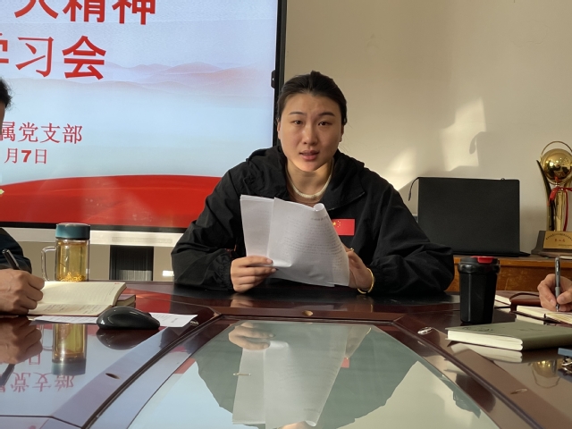 会上,许安琪简要介绍了自己参加二十大的亲身经历,带领大家一起学习了习近平总书记在开幕会上代表十九届中央委员会所作的报告内容。许安琪生动介绍了自己在国家队驻京训练十年以来感受到的生态环境变化,训练中科学技术手段的应用与更新,服务保障的升级等方面内容,并以此为案例,形象阐释了这十年来国家在党的正确领导下取得的迅猛发展和巨大变化。她表示,在参会期间,自己时刻为成为党代表亲身参与党的二十大而骄傲,时刻为身为优秀政党的一份子而骄傲,时刻为生在繁荣富强的祖国而骄傲,时刻为新时代优秀体育健儿的身份而骄傲。