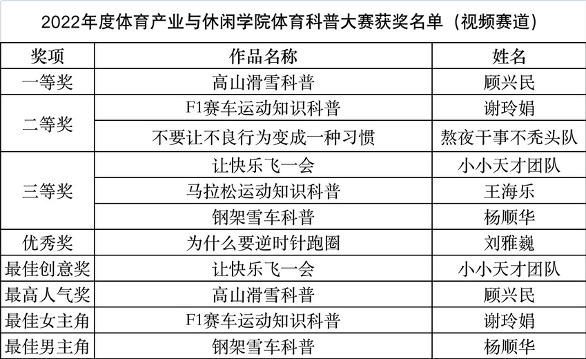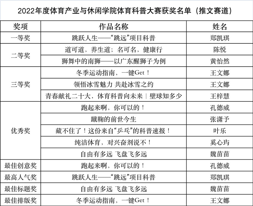 为深入贯彻党的二十大精神,广泛普及体育科学知识,促进体育科技创新发展,体育产业与休闲学院于2022年11月举办了“青春献礼二十大,体育科普向未来”为主题的体育科普作品大赛。比赛分为“体育科普微信推文”以及“体育科普微视频”两个赛道。分别设置一、二、三等奖、优秀奖,以及最佳创意奖、最高人气奖、最佳标题奖、最佳排版奖、最佳男、女主角等单项奖,同时评选数名优秀指导教师。