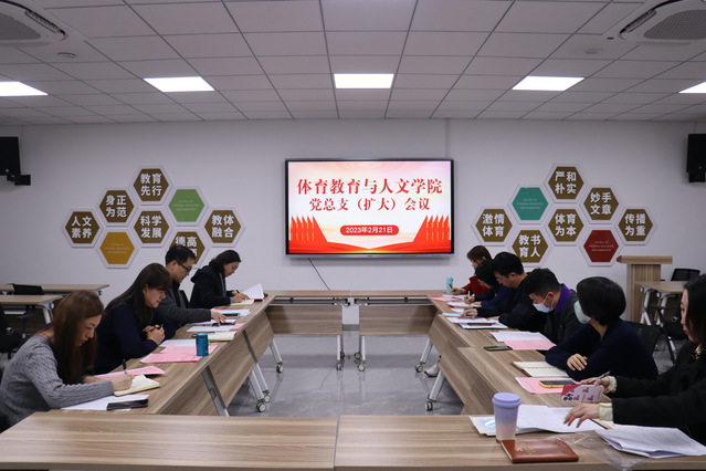 为深入学习贯彻党的二十大精神,落实全面从严治党主体责任,统筹规划新学期党建,2月21日上午,体育教育与人文学院党总支召开党总支(扩大)会议。会议由党总支书记卢奎主持,学院院长沈鹤军、副书记喻菊、副院长康晓磊出席,学院各支部书记参加会议。