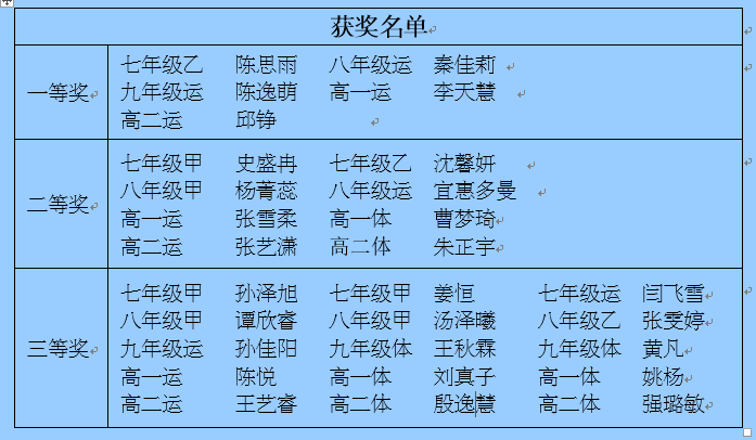 为提高运动员对数学的学习兴趣,丰富运动员的学习生活,中学数学教研组在期末考试前组织一次数学解题竞赛活动,获奖名单如下: