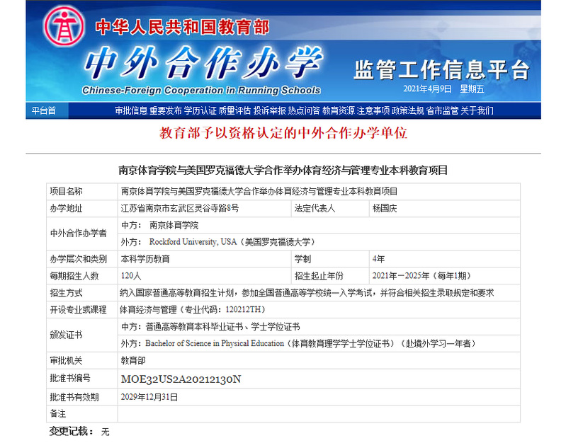 近日,教育部中外合作办学监管工作信息平台公布了2020年下半年中外合作办学项目审批结果,我校与美国罗克福德大学(Rockford University, USA)合作举办的体育经济与管理专业本科教育项目成功获批。作为我校首次申请的中外合作办学项目,该项目的获批实现了我校中外合作办学项目历史性突破。