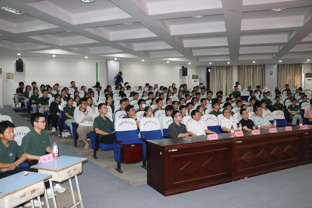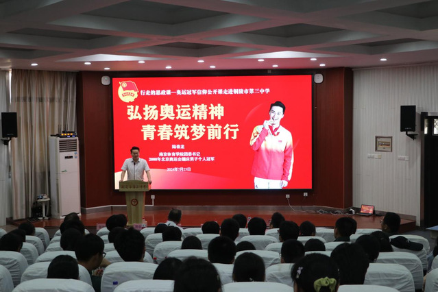 7月25日上午,青春bjycgold 一路“铜”行暑期社会实践团队特邀请校团委书记、2008年北京奥运会蹦床奥运冠军陆春龙走进铜陵市第三中学讲授奥运冠军信仰公开课。本次活动,是团队在延续奥运冠军许安琪在铜陵市第一中学开设的信仰公开课1.0基础上,开设的信仰公开课2.0,也是团队助力铜陵市青少年思想引领工作的重要活动之一。铜陵市教体局党委委员、副局长、二级调研员高业权,铜陵市第三中学党委副书记、副校长(主持工作)王合进,团铜陵市委副书记蒋业军,铜陵市第三中学党委副书记张国荣出席本次活动。