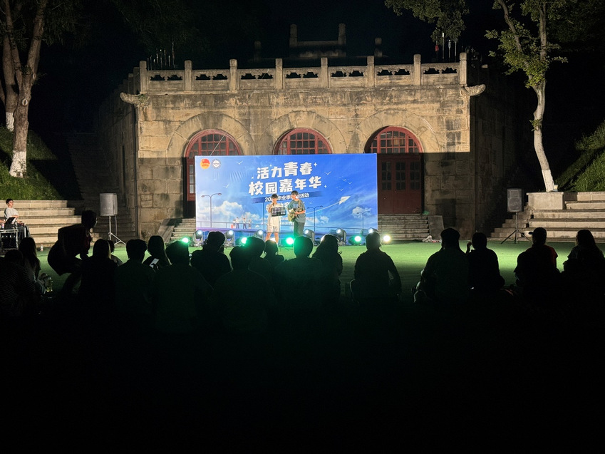 夕阳为国术场的绿色镀上金色,将这片青春的舞台渲染得格外温暖。绿茵为席、星空为幕,承载着最真挚的情感。舞台上,歌手们倾情演绎着《鲜花》等一首首承载着青春印记的歌曲。熟悉的旋律一响起,瞬间点燃了台下的共鸣。台上台下齐声合唱,用最纯粹、最嘹亮的声音,共同谱写这场献给母校、献给同窗的盛大青春诗篇。
