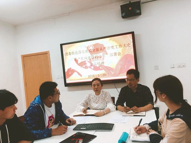 3 月 29 日下午团委召开团学骨干会议,传达我校 2018 年全面从严治党工作大会暨“作风建设启动年”部署会会议精神,会议由团委书记王猛主持。