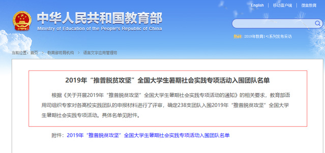 喜讯!我校三下乡暑期社会实践团队入围教育部与团中央2019年“推普脱贫攻坚”全国大学生暑期社会实践专项活动