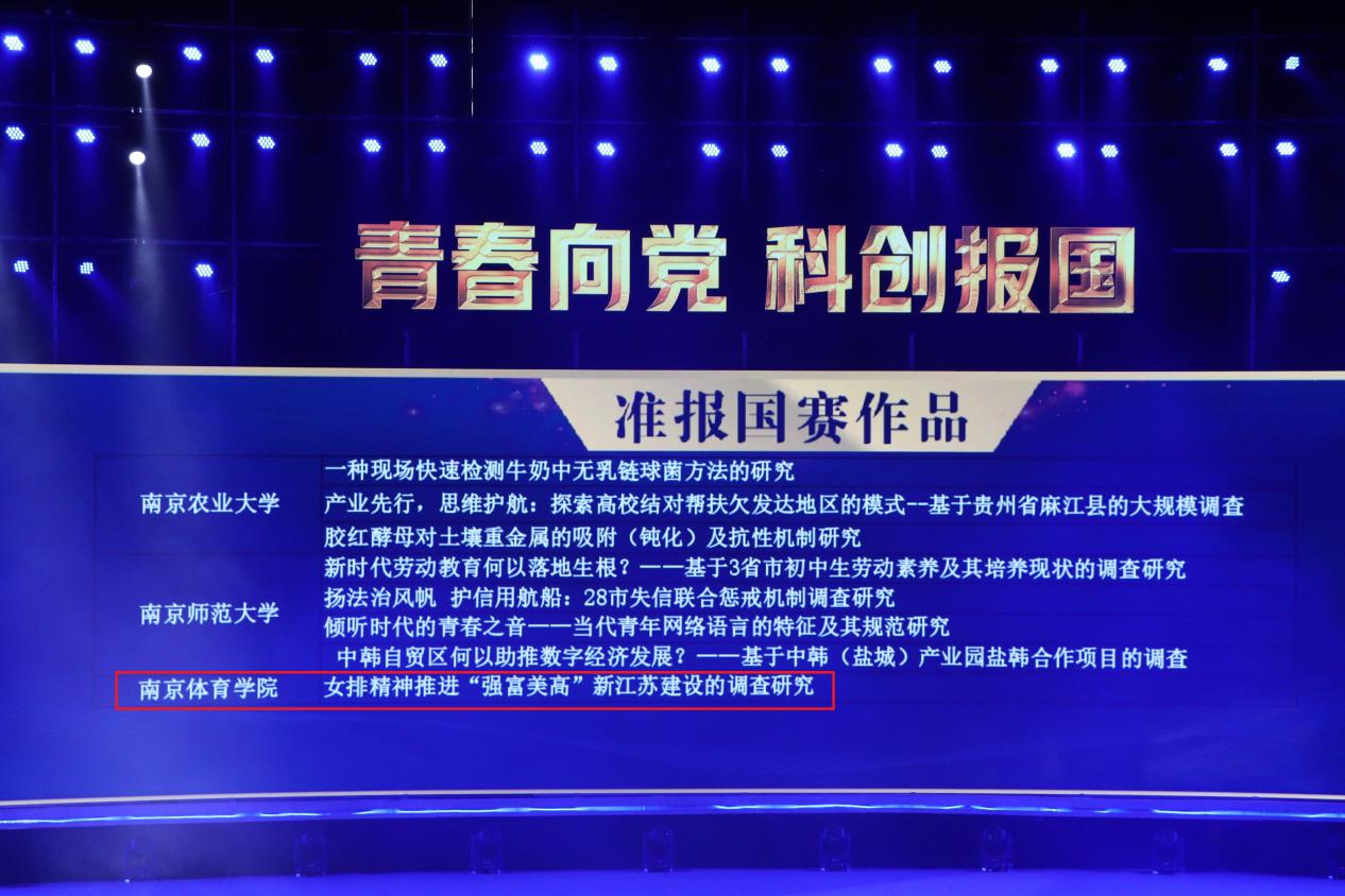 本次大赛我校共推报6个项目,经过激烈角逐,《女排精神推进“强富美高”新江苏建设的调查研究》荣获特等奖,创我校“挑战杯”赛事历史最好成绩,并获得准报国赛资格;另外,《长三角高校体育高质量发展对策研究》《聚焦需求 专业引领 国家级体育非遗石锁运动传承创新研究》《助力退役运动员职业转换的江苏经验调查研究》荣获三等奖。