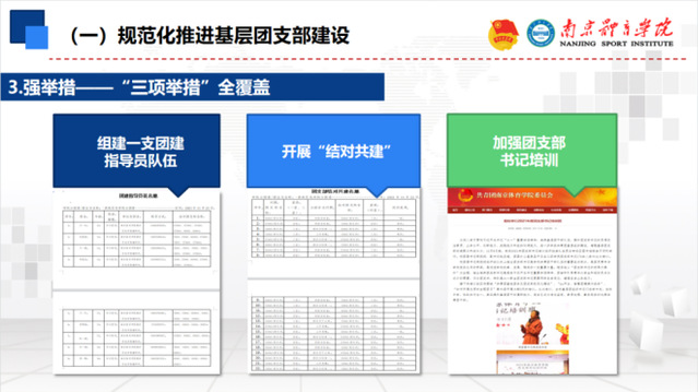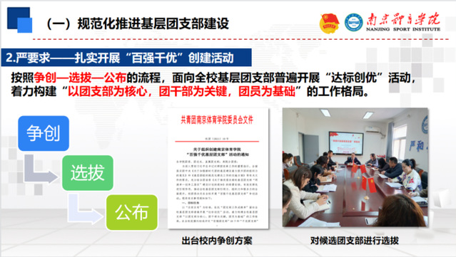 高标准实施“两清单”制度,充分发挥“团支部工作成绩单”的结果运用,进一步激发基层团支部活力。按照争创——选拔——公布的流程,面向全校基层团支部普遍开展“达标创优”活动,着力构建全校基层团支部“以团支部为核心,团干部为关键,团员为基础”的工作格局。组建团建指导员队伍,为全校176个团支部配齐团建指导员;同时5星级团支部与3星级团支部全部结对共建,实现工作帮扶。