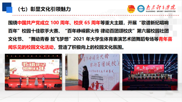 围绕中国共产党成立 100 周年、校庆 65 周年等重大主题,开展“歌谱新纪唱响百年”校园十佳歌手大赛、“百年峥嵘薪火传 律动百团颂校庆”第六届校园社团文化节等青年喜闻乐见的校园文化活动。加强和规范我校大学生艺术团的建设和管理工作,开展“舞动青春 放飞梦想”2021 年大学生体育表演艺术团舞蹈专场的演出活动,营造了积极向上的校园文化氛围。
