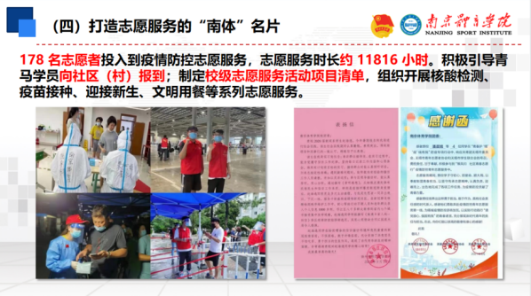178 名志愿者投入到疫情防控志愿服务,志愿服务时长约 11816 小时。积极引导青马学员向社区(村)报到,开展助力复产复工、理论宣讲、新时代文明实践志愿服务、疫情防控等形式多样的志愿服务;制定校级志愿服务活动项目清单,组织开展核酸检测、疫苗接种、迎接新生、文明用餐等系列志愿服务。