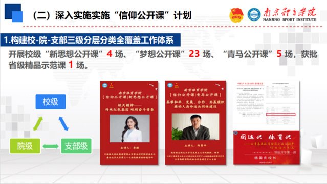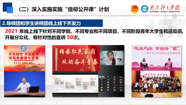 推进“信仰公开课”在校、院、团支部三个层面全覆盖,开展“新思想公开课”832场、“梦想公开课”119 场、“素养公开课”816场“青马公开课”5场,获批省级精品示范课 1 场。导师团和大学生、运动员讲师团线上线下齐发力,2021年开展分众化、有针对性的宣讲50次,着力打通青年理论武装工作“最后一公里”。