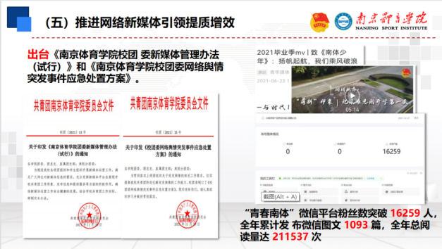 2021年校团委在校党委和团省委的领导下,以习近平新时代中国特色社会主义思想为指导,围绕立德树人为根本任务,坚持党建带团建,聚焦主责主业,积极融入大局,深入推进共青团改革,聚力提升团组织的“三力一度”,交上了一份砥砺奋进的青春答卷,为学校“十四五”事业发展开局和高水平体育大学建设贡献青春力量。