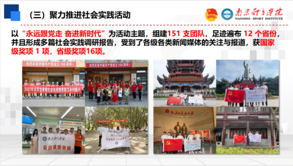 以“永远跟党走 奋进新时代”为活动主题,组建151 支团队深入基层农村、红色景点、学校、街道社区等,开展党史学习、理论宣讲、社会调研等一系列活动,足迹遍布 12 个省份,并且形成多篇社会实践调研报告,受到了各级各类新闻媒体的关注与报道,获国家级奖项 1 项,省级奖项16项。