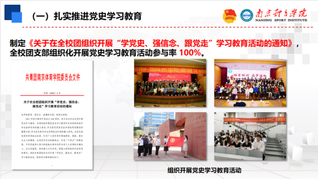 制定《关于在全校团组织开展“学党史、强信念、跟党走”学习教育活动的通知》,紧密结合我校共青团工作和团员青年实际,坚持团员自学和支部组织学习相结合,坚持理论学习和实践教育相结合,全校团支部组织化开展党史学习教育活动参与率 100%。