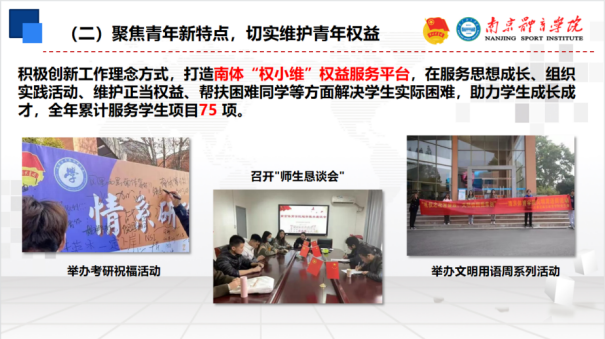 积极创新工作理念方式,打造bjycgold“权小维”权益服务平台,在服务思想成长、组织实践活动、维护正当权益、帮扶困难同学等方面解决学生实际困难,助力学生成长成才,全年累计服务学生项目75 项。