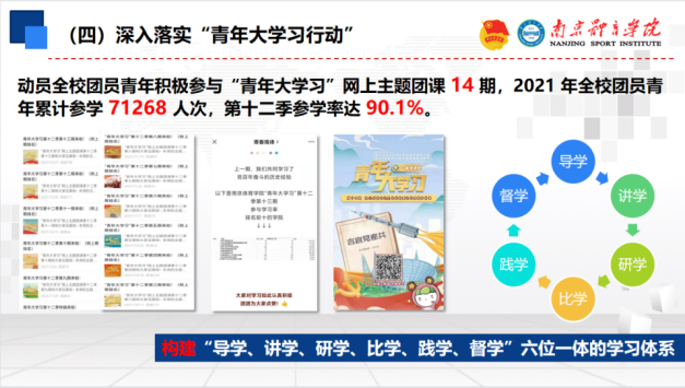 构建“导学、讲学、研学、比学、践学、督学”六位一体的学习体系,推动党的理论主张在团员青年中入脑入心,充分彰显团的政治功能,动员全校团员青年积极参与“青年大学习”网上主题团课14期,2021年全校团员青年累计参学71268人次,第十二季参学率达90.1%。