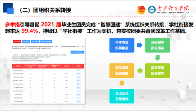 集中开展毕业学生团员组织关系线上转接工作,扎实做好“学社衔接”工作,做到科学谋划,统筹推进;分级指导,抓好落实;简化流程,细致审批;数据反馈,加强督导。2021届毕业生团员完成“智慧团建”系统组织关系转接,学社衔接发起率达99.4%。