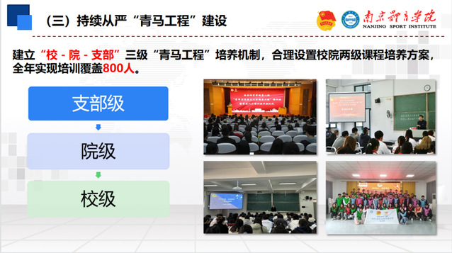 坚持“大思政”育人理念,推进思想政治引领分类分层一体化体系建设,建立“校-院-支部”三级“青马工程”培养机制,合理设置课程培养方案,构建理论学习、红色教育、实践锻炼等内容科学培养体系,全年实现培训覆盖800