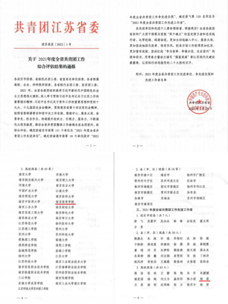 近日,共青团江苏省第十五届委员会第七次全体会议在南京召开。大会公布了2021年度全省共青团工作综合评估结果,我校团委获评“2021年度全省共青团工作先进单位”,校团委副书记杨蓉同志获评“2021年度全省共青团工作先进工作者”。