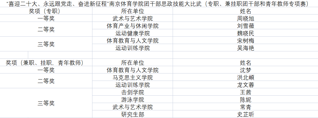 本次大赛最终评选出:专职团干部一等奖一名、二等奖两名、三等奖两名;兼、挂职团干部和青年教师一等奖一名、二等奖两名、三等奖四名。