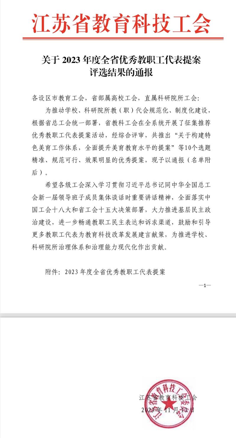 近日,从省教育科技工会传来喜讯,我校教职工代表提案获评“2023年度全省优秀教职工代表提案”。据了解,全省优秀职工代表提案征集推荐是落实教职工代表大会制度,推行厂务公开民主管理,保障职工民主管理权利的一项重要活动,旨在“聚合力 促发展 ”。通过提案,鼓励职工代表建言献策,反映职工意愿诉求,激发职工的积极性、创造性,提高企事业单位的民主管理水平,促进劳动关系和谐和高质量发展。