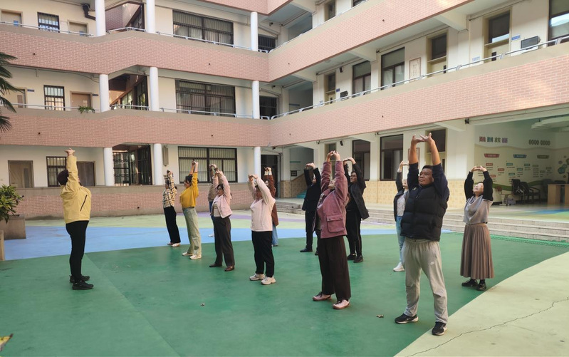 八段锦作为国家级非物质文化遗产,动作舒缓、节奏自然,能有效调节身心平衡。活动中,教师们跟随专业指导集体练习,从理论学习转向身体实践,在动静结合中感受传统文化魅力。同时,活动促进了同事间的交流互动,增强了团队凝聚力。