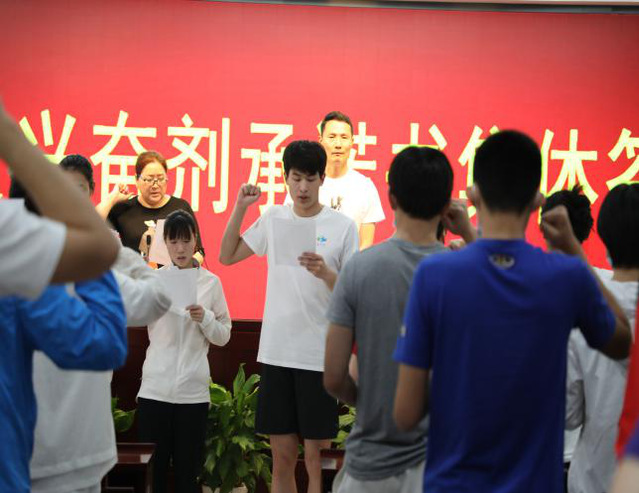 会上,学院副院长、领队孔庆玮带领全体教练员、运动员一起郑重地宣读了《反兴奋剂承诺书》,做出了庄严承诺,保证干干净净参赛,拿干净金牌,刻苦训练,努力成材;全体教练员、运动员随即现场在《反兴奋剂承诺书》上签名;最后,沈朝阳书记根据当前反兴奋剂要求和学院实际对全体与会人员提出了具体要求。